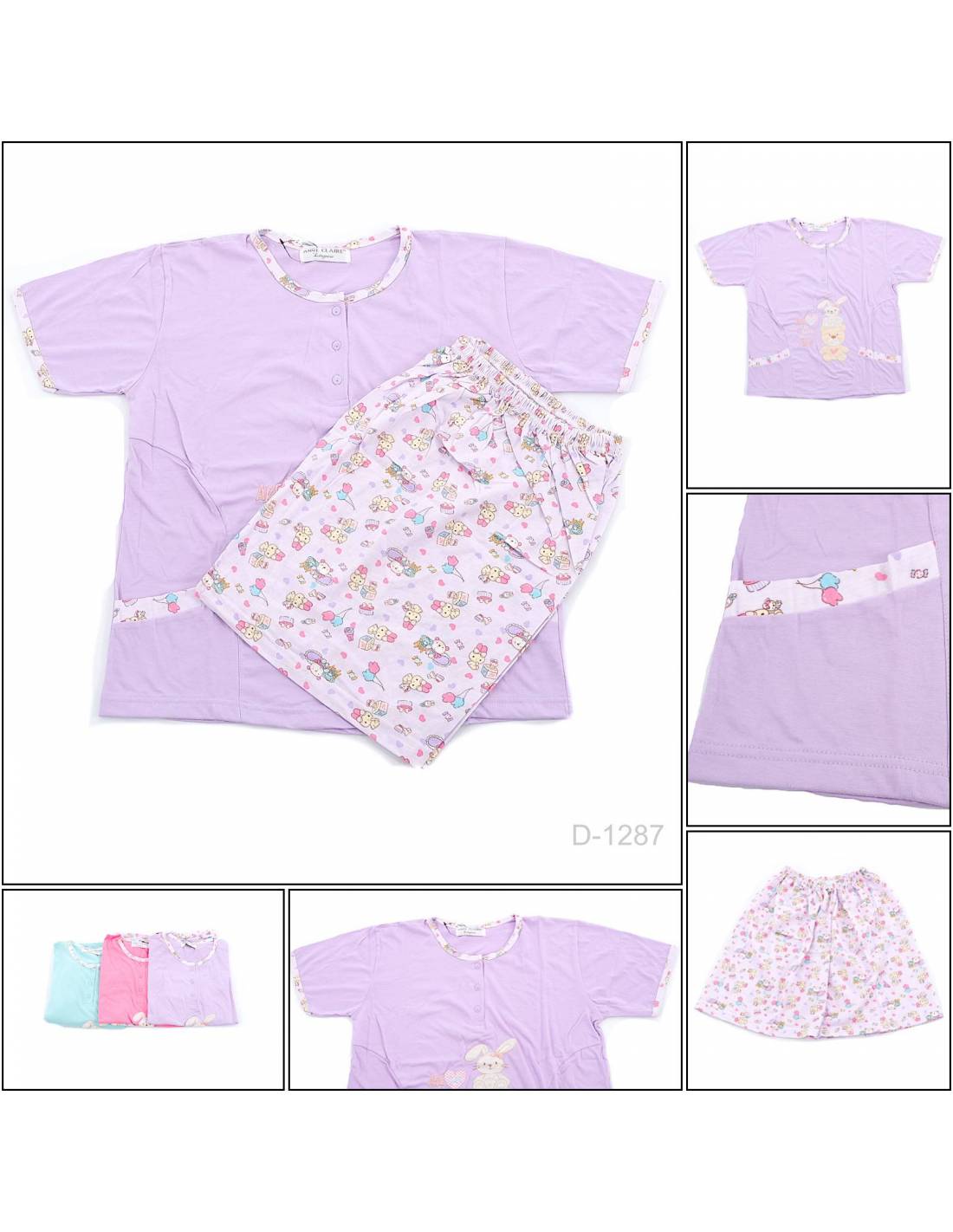 One set terdiri dari Baju Lengan Pendek dan Celana Pendek Motif.Bahannya dingin dan mudah menyerap keringat.Produk tidak terawang(tebal).Bagian leher berbentuk O-neck.Terdapat kanci
