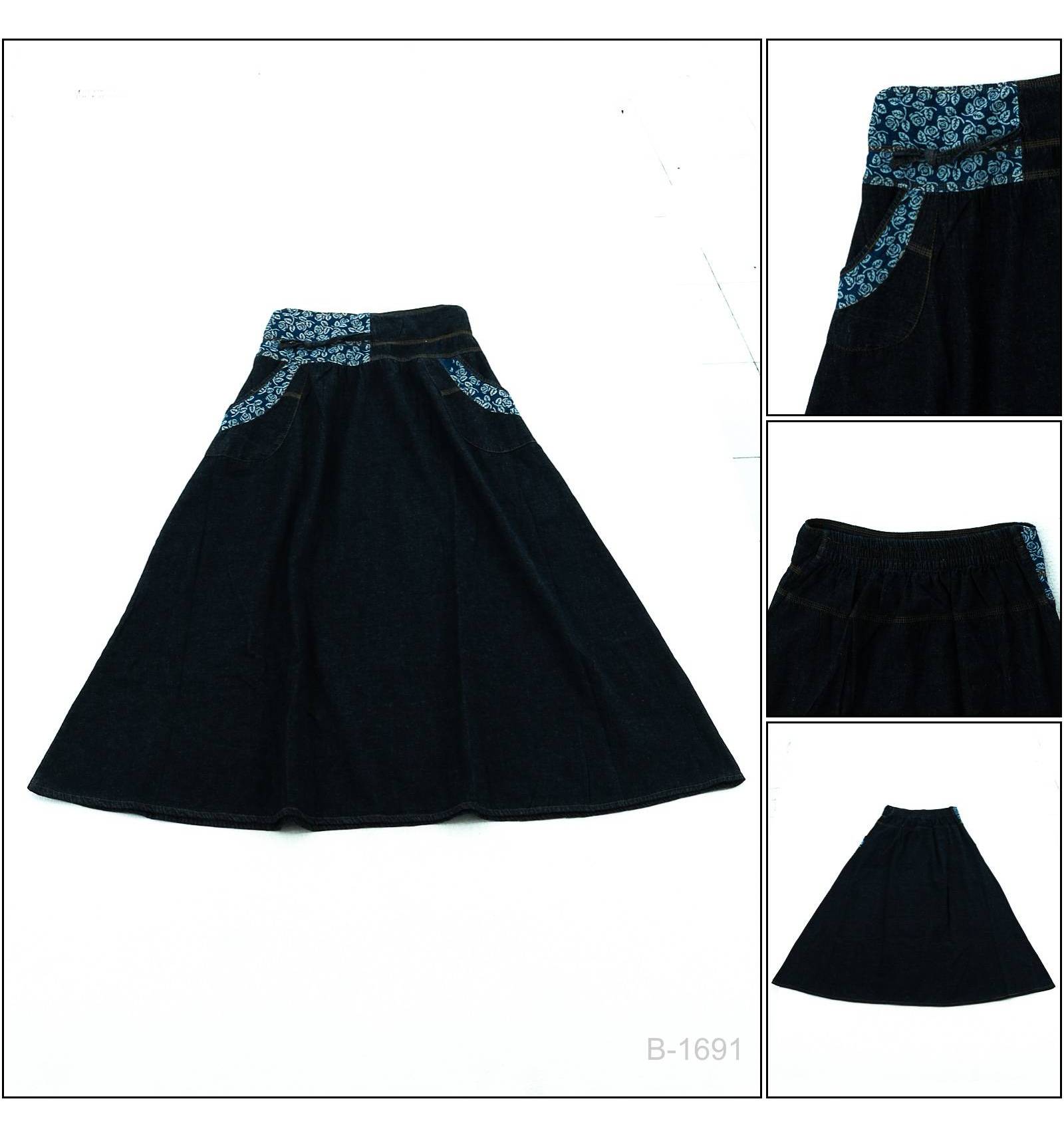 Rok panjang berbahan jeans yang ringan namun tidak tipis,terdapat saku dibagian samping serta terdapat motif dibagian pinggang