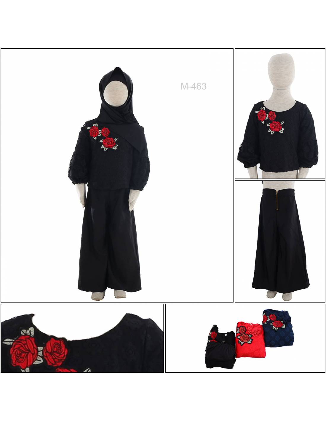 One set terdiri dari kerudung,ciput,celana,dan dress.Bagian kerah berbentuk O-Neck.Menggunakan chiffon perpaduan brukat dan terdapat resleting sebagai pengait(celana).Model Celana A